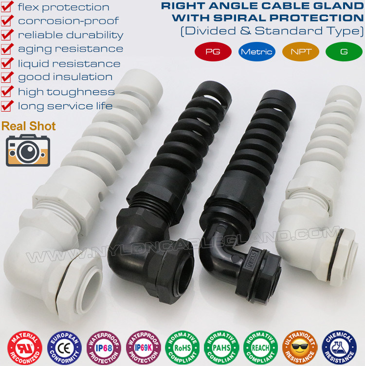 | 제품 이름: | PG 및 Metric IP68 나일론 플라스틱 엘보우(직각) 케이블그랜드(나선형 유연한 보호 장치 포함) |